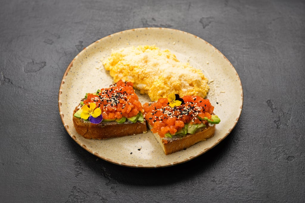 скрембл з вершками, крафтовий хліб , підсмажений з вершковим маслом, з крем-сиром та авокадо. Подається з скибочками слабосоленого лосося, посипається кунжутом та пармезаном
